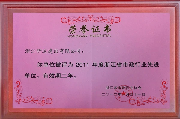 根据浙市政业[2011]31号文件《关于组织申报2011年浙江省市政行业先进单位的通知》精神及《浙江省市政行业先进单位评选办法》的规定,经舟山市市政行业协会推荐,省市政行业协会评审办公室组织对申报材料初审、评审委员会综合评议及无记名投票和网上公示等程序,昕达建设被评为2011年度浙江省市政行业先进单位。