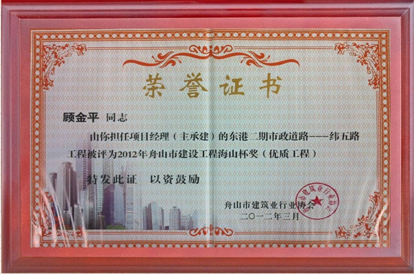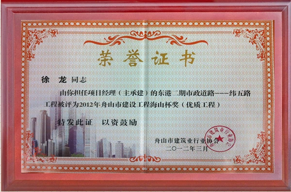 近日,舟山市建筑业行业协会公布2012年度舟山市建设工程海山杯奖(优质工程)获奖工程名单,由昕达建设承建的东港二期市政道路——纬五路工程喜获此奖。