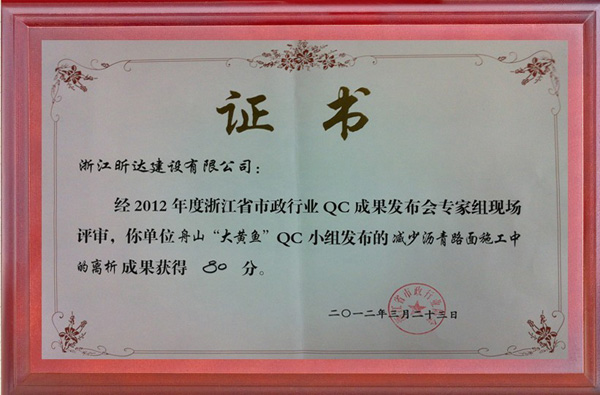 2012年3月21日,浙江省市政行业协会在浙江建设职业技术学院召开了2012年度全省市政行业优秀质量管理小组成果发布会,来自全省市政行业的近一百个QC小组参加了此次的成果发表活动。浙江昕达建设有限公司的QC小组成果《减少沥青路面施工中的离析》在众多小组中脱颖而出,经过激烈角逐,取得了80分的好成绩。这次成绩的取得对企业科技创新工作起到促进作用的同时对增强员工的科技创新意识也起到了积极作用。