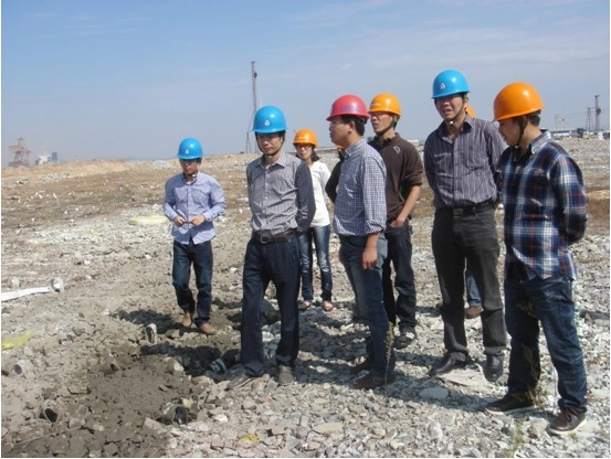 参观中,钓琅湾项目负责人王经理首先向观摩人员介绍了项目基本情况。他指出:舟山港股份钓浪码头分公司陆域堆场工程是舟山保税港区本岛分区工程的一部分,建设内容主要为集装箱堆场、件杂货堆场、综合堆场,以及辅助管理用地,总占地面积32.61万平方米,其中19.55万平方米为保税区堆场,9.06万平方米为内贸堆场。目前,该项目正紧锣密鼓的向地下埋设排水板。