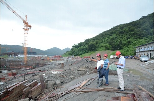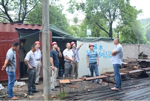 徐龙总经理在听取了施工现场负责人防台预备方案汇报及紧急应对措施后,对保证施工现场安全提出要求:首先要确保现场施工人员的生命安全,同时台风来临前要切断所有电源,加固高空架子和设备,避免建筑材料因台风吹刮而造成危害,将损失降到最低。