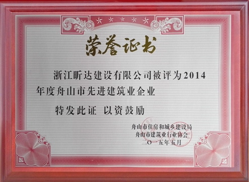 昕达建设获2014年度舟山市先进建筑业企业称号