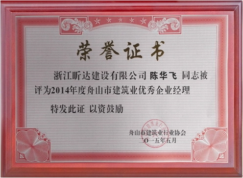 常务副总陈华飞获2014年度舟山市建筑业优秀企业经理称号