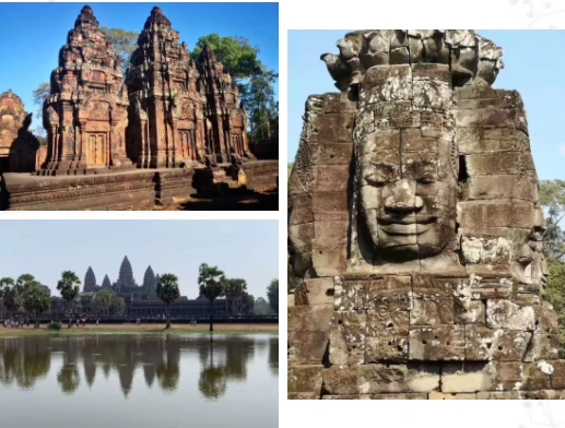 柬埔寨吴哥窟是世界闻名的旅游胜地,被称为柬埔寨的国宝,是世界上最大的庙宇,同时也是世界上最早的高棉式建筑。12世纪时,吴哥王朝国王苏耶跋摩二世希望在平地兴建一座规模宏伟的石窟寺庙,作为吴哥王朝的国都和国寺;因此举全国之力,并花了大约35年建造,1992年,联合国教科文组织将吴哥古迹列入世界文化遗产。吴哥窟的造型,已经成为柬埔寨国家的标志,展现在柬埔寨的国旗上。