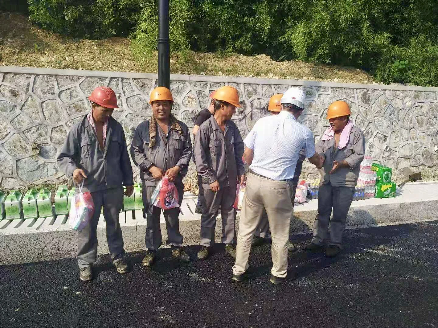 近日,329国道建设指挥部总指挥亲自来到大东岱隧道桥面段,为正在进行沥青路面摊铺的工人带来了降温和防暑用品,表达了慰问,并叮嘱大家注意高温,关注自身的安全与健康。
