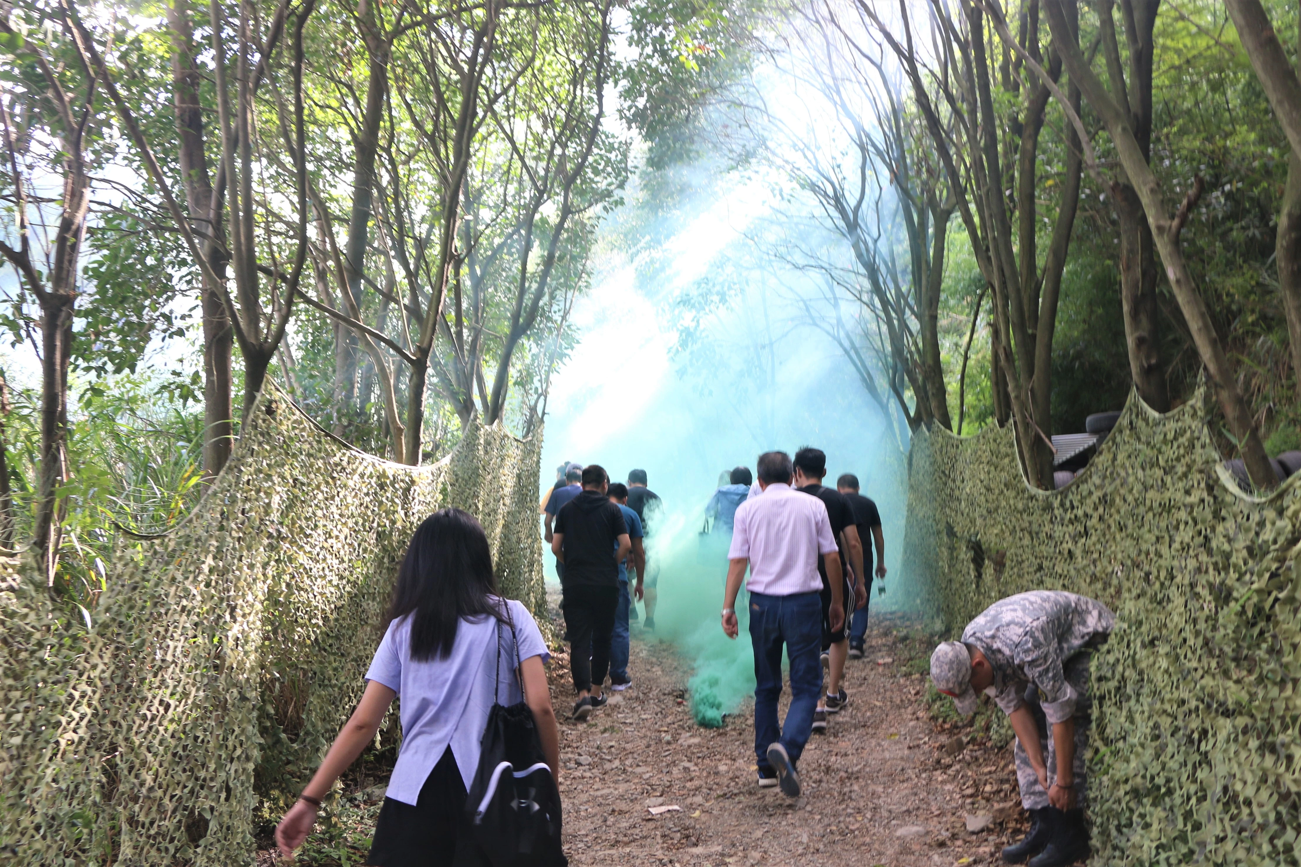 所有参加人员一下车就被集结,开始了“紧急备战、抢滩登陆”的任务。大家弓背前行,在“硝烟”中迅速到达了训练场地。
