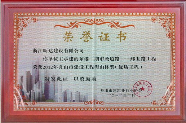 近日,舟山市建筑业行业协会公布2012年度舟山市建设工程海山杯奖(优质工程)获奖工程名单,由昕达建设承建的东港二期市政道路——纬五路工程喜获此奖。