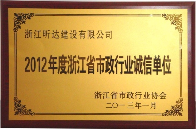 昕达建设获2012年度浙江省市政行业诚信单位称号