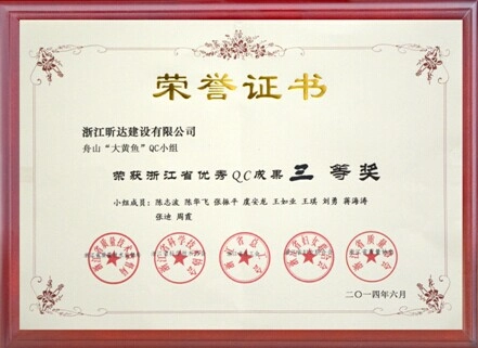 2014年度浙江省质量协会QC成果发布会于6月25—27日在桐庐开元名都大酒店举行,共有来自全省的500个QC成果参与了此次发布会,我公司舟山“大黄鱼”QC小组的两个QC成果《提高真空堆载排水板插设质量》和《提高沥青混合料面层低温季节施工质量》分别荣获浙江省优秀QC成果二等奖和三等奖。