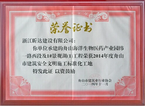 近日,舟山市建筑业协会公布2014年度舟山市建筑安全文明施工标准化工地名单,由我公司承建的舟山海洋生物医药产业园纬一路西段及1#景观湖工程获此殊荣。目前该工程正积极争创2014年度舟山市海山杯优质工程奖。