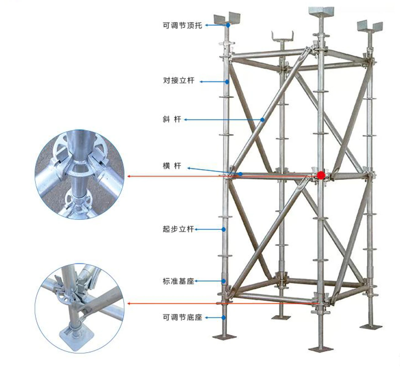 可以根据具体的施工要求,组成不同尺寸形状和承载能力的单、双排脚手架、支撑架、支撑柱等多种功能的施工装备。