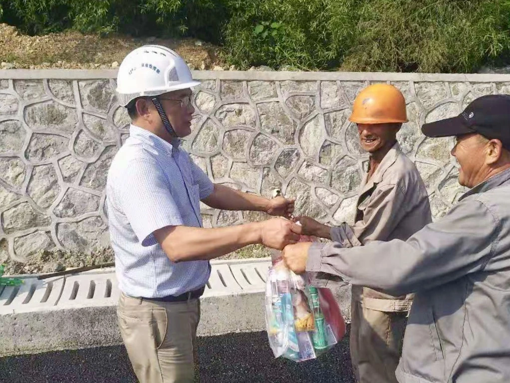 近日,329国道建设指挥部总指挥亲自来到大东岱隧道桥面段,为正在进行沥青路面摊铺的工人带来了降温和防暑用品,表达了慰问,并叮嘱大家注意高温,关注自身的安全与健康。